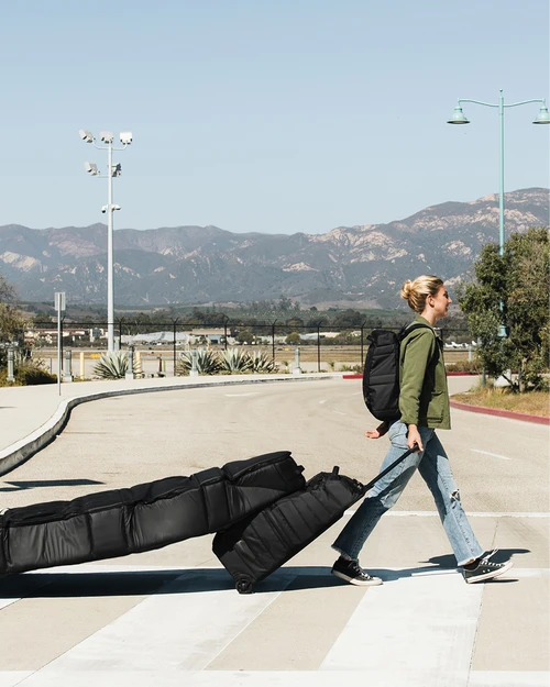 The world’s first rib protected, compressible, wheeled surfboard bag. Fits 3 to 4 boards up to 6’6”. PCT Patent pending.